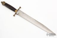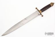 This Antique Bowie features a satin finished clip point blade with false top edge, .320" blade stock and 1.513" blade depth, hidden tang construction. The handle has a brass guard and a dark wood grip, has a brass collar and scalloped and fluted butt. Has some scratches and patina, the handle is loose, has been used and resharpened, otherwise fair condition.