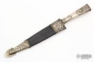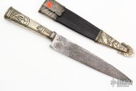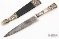 This is a Arbolito gaucho knife by H. Boker & Co has a carbon steel blade with integral guard, fileworked spine that reads "ARBOL", .195" blade stock and 1.331" blade depth, hidden tang construction. The handle is hand formed and engraved/stamped silver. It has a stamp on the bottom, but I can't quite make it out, I think it is a three digit number, probably signifying the quality of the siler. The scabbard is matching engraved/stamped silver and black leather. Has some patina, the blade has oxidation and light pitting, the silver fittings on the sheath are loose, fair/poor condition. But for some reason, it is still pretty cool for what it is. it could be cleaned up. Good project knife.
