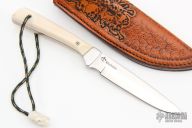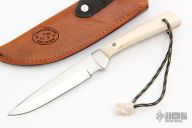 This Bird & Trout by Buckshot Knives features a satin finished drop point blade with a full tang construction.  .130" Blade Stock.  .876" Blade Depth.  The handle features steel bolsters, bone scales, mosaic pins and mahogany liners. Hand carved bone skull on the lanyard. Includes a brown leather sheath. New from maker.