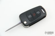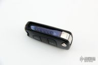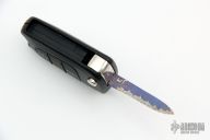 This Keyfob Auto by Warren Thomas features a chisel ground fingerprint anodized titanium blade with carbidized edge. It is made in the shape of a key and is installed into a side opening automatic keyfob. Excellent condition.