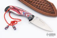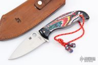 This is a unique knife with a Spyderco Mule Team has been customized by Buckshot Knives. The knife has full tang construction with .118" blade stock and 1.296" blade depth. The handle has Fordite scales with blue spacers.  Maxamet limited production 1 of 500.  Includes the original box and a brown leather sheath. African glass beads on lanyard. [New knife modified] New from maker.