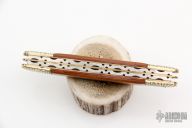 This slipjoint by Buckshot Knives features mirror polished blades with nail nicks. The handle has brass bolsters, Hawaiian KOA covers, brass liners and fileworked steel springs. New from maker.