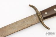 This 19TH century COLLINS & CO. HARTFORD Sword w/ brass eagle's head handle and horn grip. The blade is aslo marked "ACERO FINO CALIDAD GARANTIZADA NO. 86".  In 1876, to commemorate their 50th anniversary, The Collins Company introduced the “Legitimus” logo featuring an arm with a blacksmith’s hammer coming out of a crown, as seen on this knife. Has been used and resharpened, has dings and scratches, otherwise good condition for its age.
