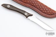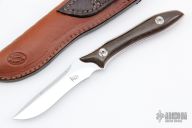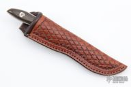This Stealth II by Todd Begg features a mirror polished blade with notched thumbrest, .122" blade stock and .896" blade depth, full tang construction. The handle has canvas micarta scales with red liners. Comes with a hand tooled brown leather sheath by Randy Mackey, and a zippered case. Excellent condition.