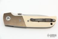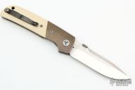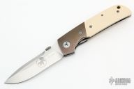This Terzuola D/A side opening automatic by Microtech Knives features a satin finish blade, tumbled titanium bolsters, ivory paper micarta scales, stainless liners, black coated titanium clip. Leaf spring bolster release. Dated 04/2004 on the blade, the clip is dated 04/2004 and S/N 0865. Has a couple light scuffs, otherwise excellent condition. Hard to find.
