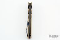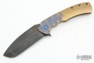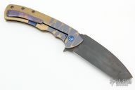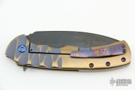 This Designated Marksman flipper by Doc Shiffer features a black multi-ground blade with fileworked thumbrest and a flipper. The handle has an anodized and textured titanium frame with a mokuti backspacer and tip up clip. Nice blade seating, detent and lockup. Rides on bearings. Has a couple light scuffs, otherwise excellent condition.