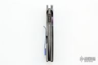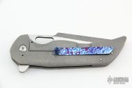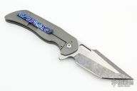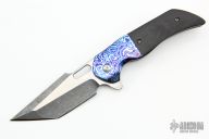 This knife by Nova Blades features a two-tone tanto blade with false top edge, thumbhole, notched thumbrest and flipper. The handle has a tumble finished titanium frame with a mokuti bolster and tip up clip, titanium backspacer. Rides on bearings, nice detent, lockup and blade seating. Excellent condition.