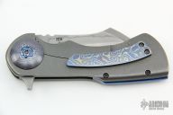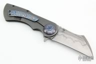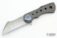 This Barrett flipper features a Hawk Bill blade with a beautiful hamon and flipper. The handle has an orange peel finished zirconium and tumbled titanium frame with polished and anodized titanium backspacer, tip up timascus clip, timascus pivot collars. Nice detent, lockup and blade seating. Flips like a dream, rides on bearings. This thing is ridiculously sweet! Comes with zippered case. Excellent condition.