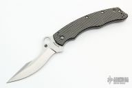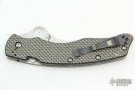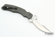 This C146CFP Szabo Folder from Spyderco features a satin finish clip point blade with swedge and thumb hole. The handle is comprised of gold line carbon fiber/G10 laminate scales over steel liners and barrel spacers. Black coated 4 way adjustable pocket clip. Lanyard tube in pommel. Has a couple light scuffs, excellent condition otherwise.
