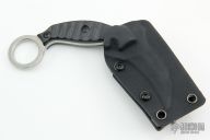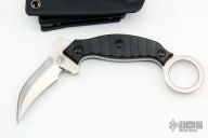 This Karambit features a satin finish blade with a sharp top edge and notched thumbrest, .189" blade stock and .825" blade depth, full tang construction. The handle has black G10 scales, .992" ring diameter. Great fit and feel in the hand. Excellent work. Excellent condition.