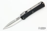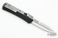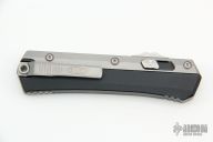 This Glykon by Microtech features a stonewashed double edged blade with fullers and notched thumbrest. The handle has a black aluminum chasis with bead blasted titanium overlays and tip down clip. Comes with original box and papers. New condition. Dated 12/2022 and #128
