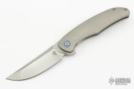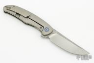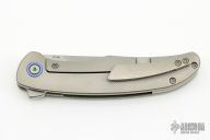 This Xerx by Adam Purvis features a stonewashed blade with a notched thumbrest and flipper.  The handle milled titanium scales, backspacer and tip up clip, purple titanium pivot collars.  Includes the original box and zippered case. Excellent condition.