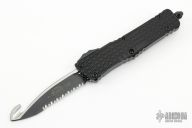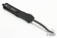 The Microtech Combat Troodon's is one of the largest dual action OTFs (Out The Front) knives available today, the Combat Troodon is the larger version of the Microtech Troodon. Hitting the ruler at almost 10 inches in total length with a 4 inch blade the combat troodon is a formidable battle ready tool, featuring CNC cut jimping on all faces of the handle and a larger slider for easy firing and retracting of the blade while wearing gloves.