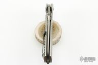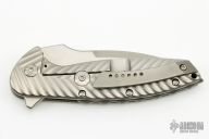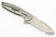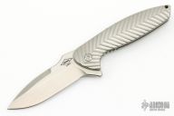 The Nitro Mini flipper from Peter Carey features a stonewashed, 20CV blade with satin finished flats. The handle consists of titanium that has Mr. Carey's easily recognizable machined pattern on the outside and milled pockets in the inside to reduce the weight of the knife, making this a very edc friendly knife at less than 5 ounces. The blade is centered when closed, flips very well on caged stainless steel bearings, and locks up with no play. Very crisp detent. Titanium pivot screw, Hinderer style lockbar stabilizer, backspacer, and flamed pocket clip that is positioned for tip up carry. These knives are 100% made in the USA. Excellent condition. Comes with a zippered case.