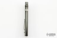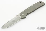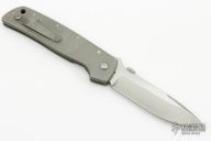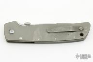 This ATCF linerlock folder by Bob Terzuola features a fine bead blasted blade with notched thumbrest and a thumbdisc. The handle has a titanium frame with a bead blast finish. Blade is made from S30V. Bead Blast titanium frame and clip, tip up carry. Has a gold inset stamped "50" and a different logo on the blade that also has 50 in the logo. Smooth action. Solid lockup, blade seating and detent. Excellent work. limited edition 1 of only 25 ever made. Has scuffs and scratches, otherwise good condition.