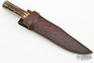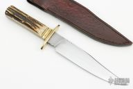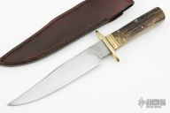 This Fighter by Master Smith JD Smith has a hand rub satin finished blade with hamone and fileworked spine, false top edge, .174" blade stock and 1.371" depth, full tang construction. Handle has a textured and fluted brass guard and stag scales with brass pins. Comes with a hand tooled brown leather sheath. Excellent condition.