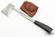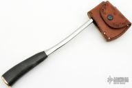 This Hatchet by Master Smith Al Pendray features a satin finished blade and shaft, 2.5" cutting edge, 3.5" from edge to poll. The handle is stacked leather witha brass butt. Comes with a brown leather belt sheath that was made by Wayne Goddard. Excellent condition.