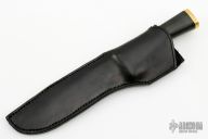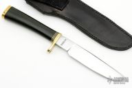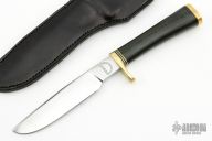 This is High Country Hunter made by Wayne Parrish and and Master Smith Don Hastings is hand forged from 5160 and has a false top edge, .229" blade stock and 1.151" blade depth, hidden tang construction. The handle has a brass guard and butt, black linen micarta grip, and black/brass spacers. Comes with a black leather sheath. Has a few light scratches, otherwise excellent condition.