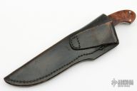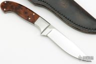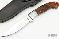 This knife by Robert Crowder features a mirror polished blade with .186" blade stock and .952" blade depth, full tapered tang construction. The handle has dovetailed stainless steel bolsters and burl wood scales with black liners. Comes with a black leather sheath stamped "224" on the back. Has a couple light scratches, otherwise excellent condition.