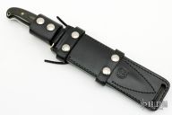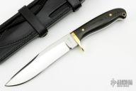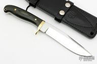 This Hunter by Robert Rippy features a satin finished drop point blade with false top edge, .253" blade stock and 1.281" blade depth, full tang construction. The handle has a brass guard and black linen micarta scales and brass pins and lanyard hole. Comes with a black leather sheath. Excellent condition.