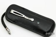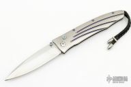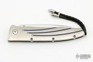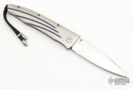 This B30 by William Henry has a satin finished blade with ZDP-189 core, single thumbstud. The frame is titanium with milled and anodized pattern. Release button and thumbstud have a sapphire inset in gold bezel. Has some scratches, otherwise good condition. Comes with leather sheath.