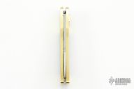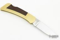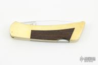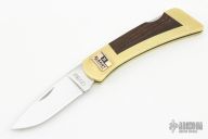This Folding Sportsman I by Gerber features a mirror finished blade with nail nick. The handle has a brass frame with wood inlays. The handle has an overlay that says "Albany International". Has some light scratches, otherwise good condition.