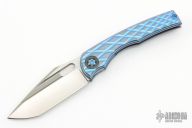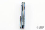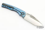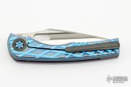 This BBM V2 by Nick Chuprin and Robert Carter features a satin finished blade with fullers, thumbhole and hand ground bevels. The handle has a tumbled and anodized titanium frame, anodized titanium pivot, screws, zirconium pivot collar and backspacer and a zirconium  tip up clip with hidden screws. Rides on bearings, nice detent, lockup and blade seating. Comes with a zippered case. Excellent condition.