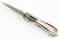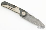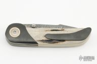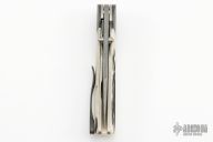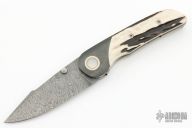 This P1 Linerlock by Edward R. Knives features a Mike Norris Fireclone Damascus blade with dual thumbstuds. The handle has orange peel finished zirconium bolsters and tip up clip with hidden screws, stag scales, Westinghouse paper micarta pivot collars and backspacer, orange peel finished titanium liners. Rides on bearings, nice detent, lockup and blade seating. Comes with zippered case and COA dated 8/2022. Excellent condition.