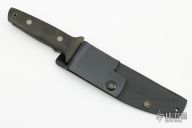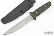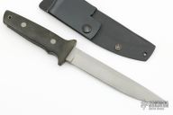 This Knife by Bob Terzuola features a bead blasted drop point blade with a notched thumbrest, .199" blade stock and 1.009" blade depth, hidden tang construction. The handle is black linen micarta with non-slip grip on the bottom of the handle and a lanyard hole. Comes with kydex sheath. Has a few light sheath marks, otherwise excellent condition. Marked "109G" under the ricasso.