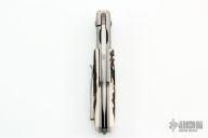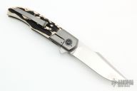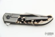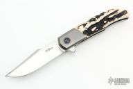 This Framehorn Flipper by David Sharp features a hand rub satin finished blade with a notched flipper and thumbrest. The handle has a bead blasted titanium frame with stag scales, zirconium pivot collars and backspacer, bead blasted titanium tip up clip. Nice detent, lockup and blade seating. Comes with a zippered case. Excellent Condition.