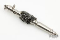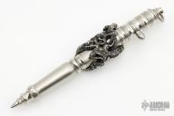 This Bolt Action Pen from Hidetoshi Nakayama features has a turned stainless steel grip and shaft, bolt action locking mechanism, and lanyard ring. The pen is adorned with a silver octopus with brass skull. Refillable - takes Schmit P900M refills. Excellent condition.