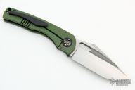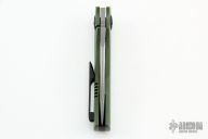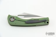 This BBM V2 by Nick Chuprin and Robert Carter features a hand rub satin finished Magnacut blade with fullers, thumbhole and notched thumbrest, hand ground bevels. The handle has a green cerakote titanium frame, black titanium pivot collar, backspacer and tip up clip with hidden screws. Pivot is titanium with a mokuti inlay. Rides on bearings, nice detent, lockup and blade seating. Comes with a zippered case. Excellent condition. Signed "R Carter" inside the backspacer.