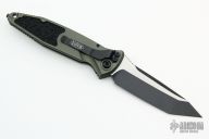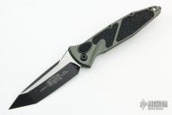 This Socom Elite Auto has a two-tone tanto blade with notched thumbrest. Green aluminum handle with non-slip inserts. Stainless steel clip, tip down carry. Glass breaker. Dated 04/2019 and s/n 3059. Comes with original box and papers. Excellent condition.