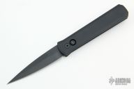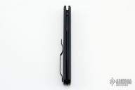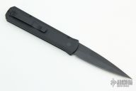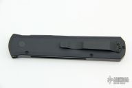 This knife features a black sterile blade. The handle has a black aluminum frame with black hardware and black stainless steel tip up clip. There is a lantern inlaid into the push button. Comes with original box and papers. New condition.