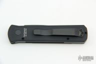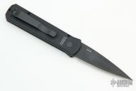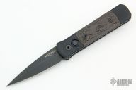 This Godson Steampunk side opening button lock auto from Pro-Tech (#20 of 200) has a black coated spear point blade with false top edge. Handle is black aluminum with dark antique bronze Shaw designed Steampunk A-side inlay, and black coated stainless steel tip up clip. Comes with original box and packaging. Excellent condition.