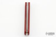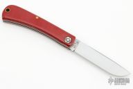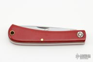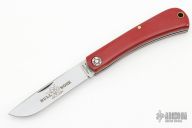This Farm and Field Tool Bullnose by Great Eastern Cutlery features a satin finished drop point blade with swedge and nail nick. The handle is comprised of red linen micarta scales with brass pin and lanyard tube over stainless steel liners and backspring. Excellent condition. Includes original cardboard tube packaging and wax paper wrapping.