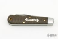 Handle: The teardrop shaped handle has stainless liners supporting securely pinned, OD Green canvas Micarta covers for rugged visual appeal and traction in the hand. Brushed short stainless bolsters at the pivot are flush fit to the scales. Strong, full length stainless back springs, brass lanyard tube and pins complete the construction along with a wide, "Urban Jack" Bowtie shield round out construction.