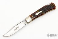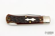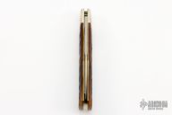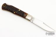 Handle: Built with traditional brass liner and pin construction, the compact handle sports "Dark Brewed" jigged bone covers, polished and grooved nickel silver bolsters and matching Orleans shield. The handle offers a solid grip and has a hollow brass pin for lanyard attachment. The full length back spring protects the blade when closed and forms the lock back mechanism for safe, secure use.