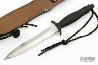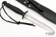 The Mark II is one of the best selling knives of all time. First introduced in 1966, this tactical knife is serialized for collectors. This one has a satin finished hand ground double edged partially serrated blade, .243" blade stock and .940" blade depth, hidden tang construction with a black aluminum handle. This knife is Serial #B7433S and was made in 1983. Comes with a black leather sheath. Excellent condition.