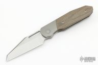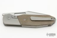 This GOM by Renegade Provisions Company features a satin finished blade with thumbhole, notched thumbrest and flipper. The handle has titanium bolsters with integral liners, canvas micarta scales, titanium backspacer with lanyard pin, tip up titanium clip.  Includes original box.  #1106/480 Excellent Condition.