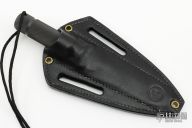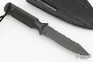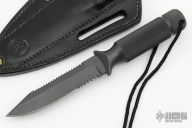 The 4” bladed Aviator is a good everyday carry knife. " Knife and sheath are in excellent condition. The blade has a false top edge and sawteeth, partial serrations, .180" blade stock and .863" blade depth, integral construction with hollow handle. Comes with original black leather sheath, original box and papers dated December 12 2000. Made in USA.  Excellent Condition.  This knives was a special order with the serrations, written on the COA.