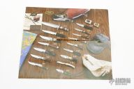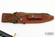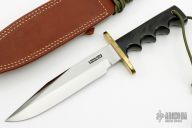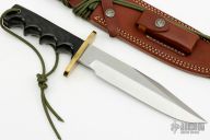 This Model 14 by Randall Made Knives features a satin finished blade with sharpened top edge, .222" blade stock. 1.392" blade depth, full tang construction. The handle has a brass guard, black linen micarta handle with a lanyard hole at the butt. This knife was designed to meet the demand for an almost indestructible all-purpose knife, though it is especially suited for combat and survival purposes. Comes with brown leather sheath. Excellent condition.