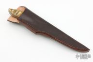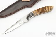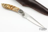 This Fighter by Sam Cox features a hand rub satin finished blade with sharpened top edge, .159" blade thickness and .828" blade depth, full tapered tang construction. The handle has dovetailed stainless steel bolsters that have been engraved by S. Hostle, sheep horn scales with red liners, scrimshaw on both sides done by the maker. Includes a black leather sheath with belt loop. Excellent condition.