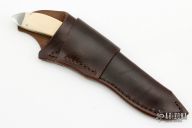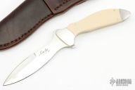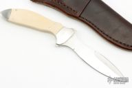 This Fighter by Sam Cox features a hand rub satin finished blade with sharpened top edge, .101" blade thickness and .896" blade depth, full tapered tang construction. The handle has dovetailed stainless steel bolsters , ivory paper micarta scales with black liners. Includes a brown leather sheath with belt loop. Excellent condition.