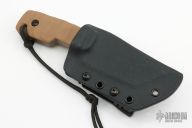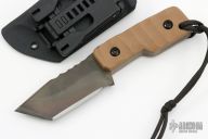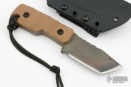 This Tanto from Crusader Forge features a  KG Gunkote finished blade, full tang construction with blade thickness of .249" and depth of 1.383", full tang construction.  The handle has Coyote Brown G-10 scales, lanyard hole at the butt. Comes with a kydex sheath with TekLok. Has a couple light scuffs on the blade, otherwise excellent condition.