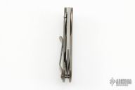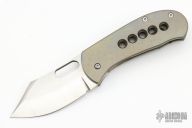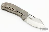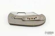 This Puffin folder by Chuck Gedraitis features an satin finished blade with a false top edge and thumbhole. The handle has a tumbled and anodized titanium frame and tip up clip. Nice detent, lockup and blade seating. Comes with padded zippered case. Excellent condition.