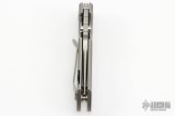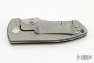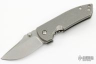 This ESV frame lock by Les George features a stonewashed blade, notched thumb rest and dual thumb studs. Stonewashed titainum frame and pocket clip for tip up carry. Smooth function with a good lock up, blade seating and nice detent. Excellent condition.