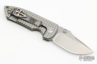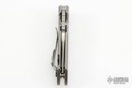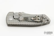 This ESV frame lock by Les George features a tumble finished blade with notched thumb rest and dual thumb studs. The handle has a MEFP pattern stonewashed titainum frame and a Steel Flame Crusader Cross pocket clip for tip up carry. Smooth function with a lock up and nice detent. Excellent Condition. 1 of 12