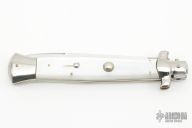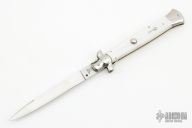 This 15" Swivel Bolster by Stiletto Siciliano features a satin finish blade. The handle is comprised of stainless steel guard and bolsters with pearlex scales over brass liners and stainless steel backspacers. Has some scratches, otherwise excellent condition.