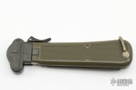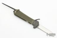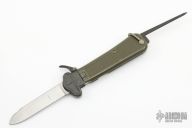 This German Army Paratrooper Knife from Bund features a spear point satin finish gravity blade. The handle is comprised of a steel guard and lever with OD Green plastic scales over metal frame. D Ring lanyard bail and lanyard on pommel. Knife also features a steel C4 punch/Marlin spike that deploys to the rear of the knife. Excellent condition.